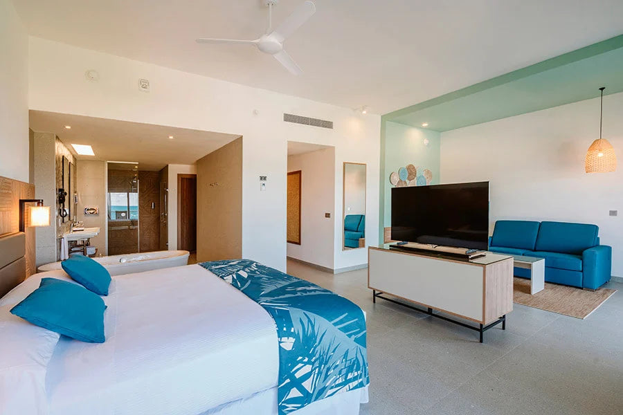 The Hotel Riu Latino in Costa Mujeres, Cancun, is an Adults Only retreat offering a 24-hour all-inclusive experience with direct beach access. With modern rooms, five outdoor pools, including swim-up bars and in-water loungers and an exclusive beach area. Enjoy a variety of activities, from water sports like kayaking and snorkeling to nightly entertainment, shows, and a nightclub. Dining options include buffet and à la carte restaurants featuring Italian, Asian, and steakhouse cuisine, plus all-day snacks and drinks.